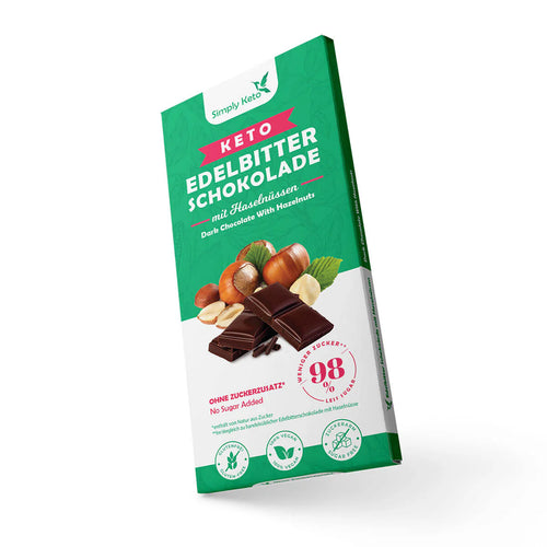 🤩 98% less sugar - Simply Keto fine dark chocolate with hazelnuts has only 4 g net carbohydrates per 100 g and 25% fewer calories compared to conventional chocolates.