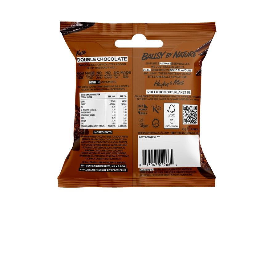 The healthier alternative to a brownie, these bites contain 2.9g NET carbs per bag and only 1.7g of sugar making them the perfect snack to add into your KETO diet. With added vitamins and minerals, our KETO balls come in a conveniently sized bag, ideal for taking with you on the go.